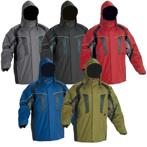 Vízhatlan, meleg bélésű dzseki gallérba rejthető kapucnival.