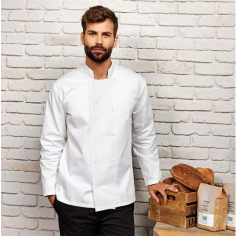 Fabric65% Polyester 35% Cotton twillFeaturesEasy care long sleeve chef?s jacketTen button hole wrap over fasteningHigh quality long-life resin buttonsUnisex sizing