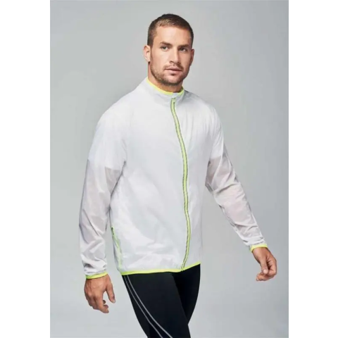 100% polyamide ripstopUltra-lightweight quick-drying fabricRaglan sleevesNeon elasticated tipping on neck cuffs and hemZip front fastening with reflective bandJacket can be folded up into zipped side pocket(Packaway design with hanging hook)