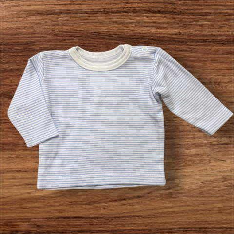 Kék csíkos felső Egyenes szabású, kerek nyakkivágású, vállnál patentos. Kellemes pamut anyag. Hibátlan állapotú.