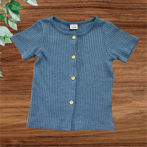 Kék, gombos felső Egyenes szabású, kerek nyakú, eleje végig gombos. mell:2x27cm hossz:36cm Hibátlan állapotú.