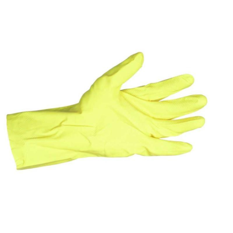 Háztartási munkákra alkalmas, 0,35 mm vastag, természetes latexből készült sárga kesztyű, belül velúrkikészítéssel. Teljes hossza: 30,5 cm.