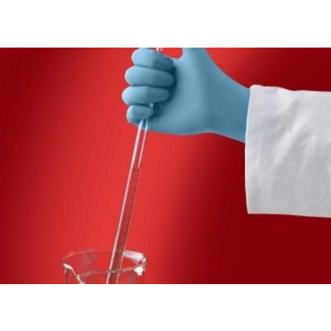 0,12 mm vastag, 100 %-os, adalékmentes nitrilből készült, nem púderezett, egyszer használatos kék kesztyű sodrott széllel. Teljes hossza: 24 cm.