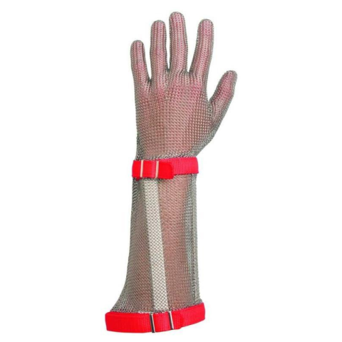 Maximális vágás elleni védelmet nyújtó, mindkét kézen hordható, rozsdamentes acélgyűrűkből készült kesztyű összehúzó textilpánttal, alkarvédővel és 15 cm széles mandzsettával.