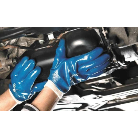 Vastagon mártott, nitril bevonatú, varrott pamutkesztyű, csúszásgátló bevonattal, rugalmas, kötött mandzsettával, amely a szennyeződések bejutása ellen véd. A kesztyű alkalmas koptató anyagokkal történő munkavégzésre, erősen olajos környezetben.