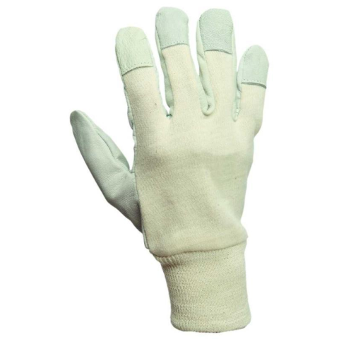 Színbáránybőr tenyerű és pamutszövet kézhátú kesztyű átfedett ujjhegyekkel és kötött mandzsettával.