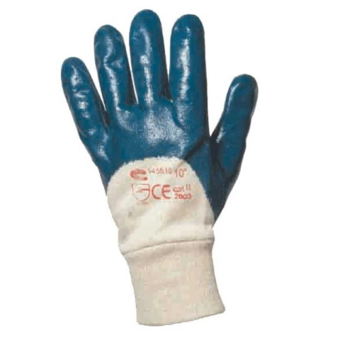Kötött pamutkelméből varrt, nitrilbe félig mártott kék kesztyű rugalmas mandzsettával.