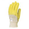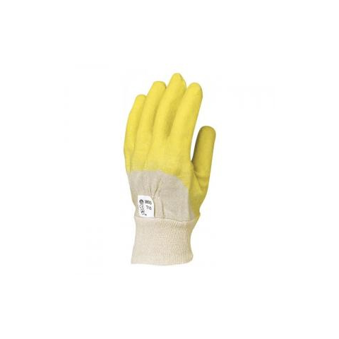 Munkavédelmi kesztyű szövött pamut alapkesztyűre ökölcsontig mártott sárga latex bevonattal. Gumírozott mandzsetta, szellőző kézhát, csúszásmentes vágásbiztos érdesítés.