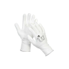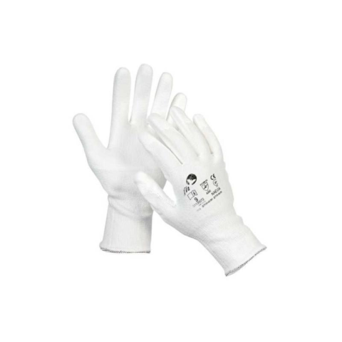 Kötött védőkesztyű DYNEEMA nylon szálból, magas vágásállósággal. Fehér PU mártással tenyéren.