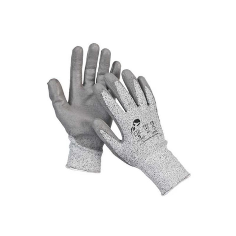 Kötött védőkesztyű DYNEEMA szálból és magas vágásállóságú nylonból. Tenyéren szürke PU mártással.