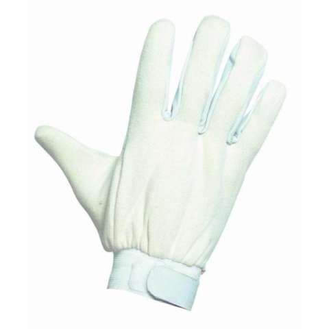 Finom színkecskebőrből varrt tenyerű és fehér pamutszövet kézhátú kesztyű tépőzáras mandzsettával.