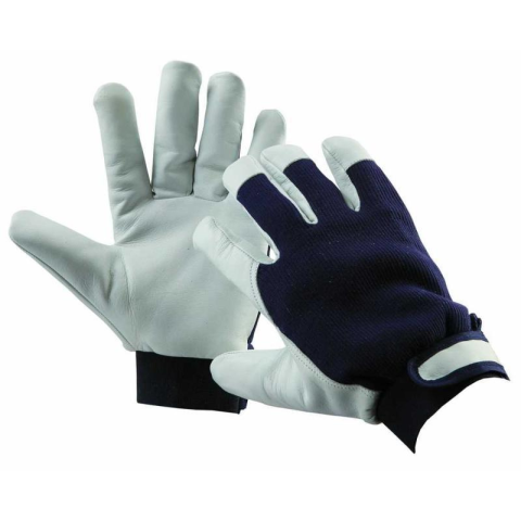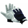 Finom színkecskebőrből varrt tenyerű és kék pamutszövet kézhátú melegen bélelt kesztyű tépőzáras mandzsettával.