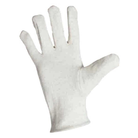 Fésült kötött pamutkelméből a "fourchette" szabás szerint varrt, mandzsetta nélküli kesztyű. Teljes hossza: 23 cm.
