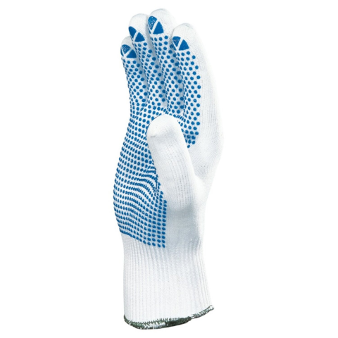 Kötött poliamid kesztyű 9-es méretben. Tenyérrésze és ujjbegyei PVC-vel pöttyözöttek a csúszásmentes használat érdekében. Könnyű és kényelmes viseletet nyújt.