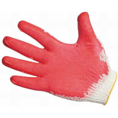 Különböző színű kötött, varratmentes pamut kesztyű színes PVC-be félig mártott tenyérrel és ujjakkal, valamint rugalmas mandzsettával.