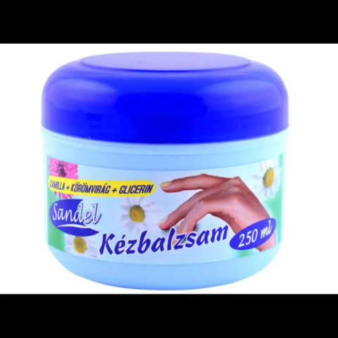 Sandel pumpás kézbalzsam száraz, igénybevett kézbőr ápolására. A termékleírás szerint kamilla- és körömvirág-kivonatot valamint glicerint tartalmaz, melyek nyugtató, regeneráló és hidratáló hatással bírnak. Könnyen beszívódó formulájuk lágyítja a bőrt és segít fenntartani annak rugalmasságát.