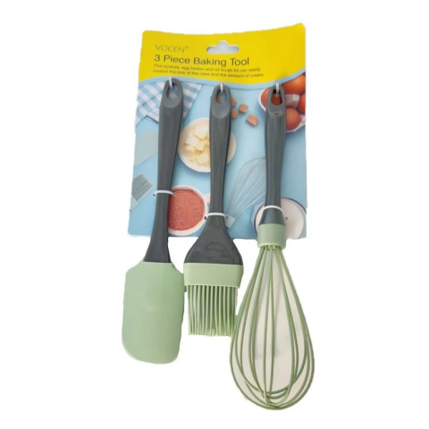 Hasznos konyhai eszközökből álló szett, amely ideális mindennapi sütési és főzési feladatokhoz. Praktikus és tartós megoldás. A 3 részes konyhai sütőszett tartalmaz egy szilikon spatulát (24,5 cm), egy szilikon olajecsetet (22,5 cm) és egy habverőt (27