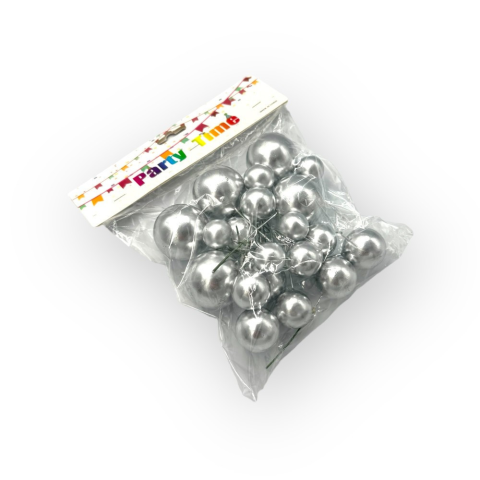 Elegáns, műanyag gömb alakú tortadísz szett különböző méretekben, 20 darabos kiszerelésben. Látványos és stílusos dekoráció tortákhoz, desszertekhez, ünnepi alkalmakra. Díszítse tortáit ezekkel a különböző méretű, matt ezüst színű, műanyag gömb alakú t