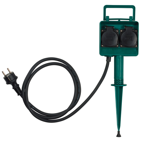A kettes kültéri dugaszoló aljzat földbe szúrható, és max. 3500 W teljesítményű készülék kültéri használatra alkalmas. Két fogyasztó csatlakoztatható hozzá, 1,4 m hosszú hálózati kábellel és dugós csatlakozóval rendelkezik. A kerti dugaszoló aljzat az apró méretű tárgyaktól a fröccsenő víztől védett.
