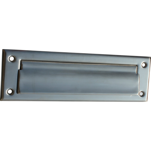 Kívülről szerelhető, rozsdmanetes acélból készült levélbedobó, amelynek fedele rugós kivitelű. Méret: 254 mm x 73 mm.