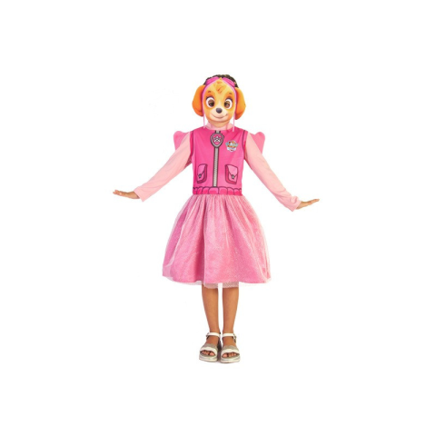 Korosztály: 5 - 7 év Mancs őrjárat Skye kutyát ábrázoló jelmez, amely egy rózsaszín ruhából álló szett. A csomag tartalmaz egy pár szárnyat, egy Skye kutyára hasonlító maszkot, egy csillogó szoknyát. A jelmez hosszú ujjú, a szoknya két rétegű, hogy ne legyen átlátszó. A jelmez hátul praktikus tépőzárral nyílik a nyakánál, a szárnyak felül tépőzárral rögz