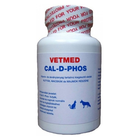Vetmed Cal-D-Phos a kutyák, macskák és majmok normális csont- és fogfejlődéséhez szükséges anyagokat tartalmazó tabletta. Megfelelő mennyiségben és arányban tartalmaz kalciumot és foszfort és az ezek felszívódásához nélkülözhetetlen D-vitamint, amelyek szükségesek a megfelelő fog- és csonterősítéshez és az egészséges fejlődéshez. Mindezek miatt ideális választás fiatal, nagy testű (hirtelen növekedésű) kutyák csonterősítésére és egészséges