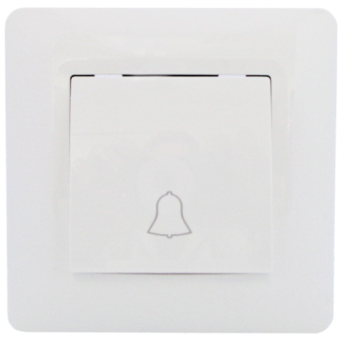 Süllyesztett kivitelben készült, fehér színű nyomókapcsoló. A nyomógomb dekoratív csengőjellel van ellátva.