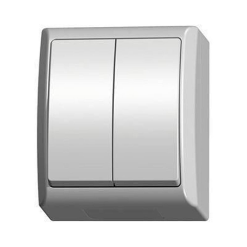 Kétbillentyűs csillárkapcsoló, amely egy fogyasztói csoport megosztott kapcsolására, ill. két különálló helyiség egy helyről történő fel-és lekapcsolására alkalmas. IP44 védelemmel rendelkezik, rugós bekötésű. Feszültség: 250 V. Áramerősség: 16 A.