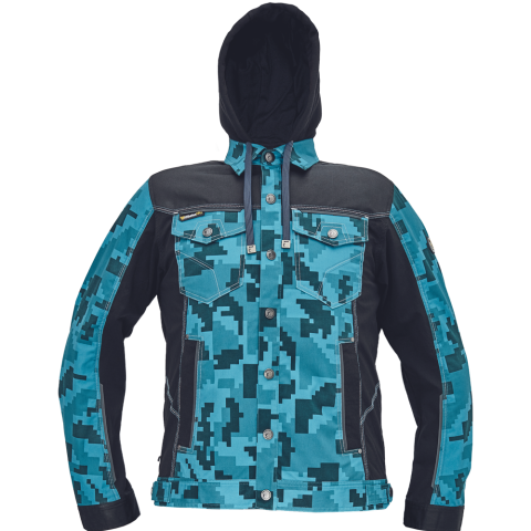 NEURUM CAMOU kapucnis dzseki petrol 56 • férfi munkakabát férfi munkakabát innovatív, pamutgazdag, rugalmas TRIFIBETEX, illetve TRIFIBETEXPRO® anyagokból CORDURA® betétekkel, digitális terepmintával, fém gombok, állítható ujjvégek, 2 oldalsó zseb, 2 ci