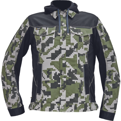 NEURUM CAMOU kapucnis dzseki olajzöld 60 • férfi munkakabát férfi munkakabát innovatív, pamutgazdag, rugalmas TRIFIBETEX, illetve TRIFIBETEXPRO® anyagokból CORDURA® betétekkel, digitális terepmintával, fém gombok, állítható ujjvégek, 2 oldalsó zseb, 2