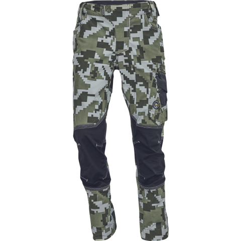 NEURUM CAMOU nadrág sötét olajzöld 46 férfi munkanadrág innovatív, rugalmas TRIFIBETEX® anyagból, CORDURA® betétekkel digitális terepmintával, elöl 2 ékzseb, hátul 2 tépőzáras foltzseb, bal oldalt nagy multifunkciós zseb, jobb oldalt multifunkciós vona