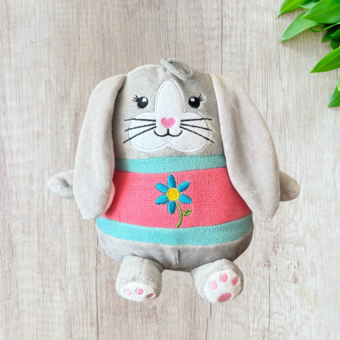 Puha plüss nyuszi, kötött ruhában, felakasztható. Méret:25cm Hibátlan állapotú.