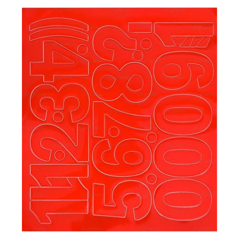 Öntapadós matrica, 5 cm-es, számlap, piros Öntapadós vinil tapétából hőpréssel stancolt számlap. - a kívánt öntapadós karakterek könnyedén kiszedhetőek - a méret a szám magasságát jelenti - karakterek magassága: 5 cm - piros alapon fehér számok