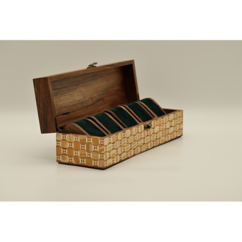 Cégünk által gyártott egyedi készítésű mintás fa karóratartó. Méret (szx mé xma): 32,5 cmx 10 cmx 9 cm, puha belső borítással. Hasznos információ: nem bírja a párát, a nedvességet és az erős hő behatását!