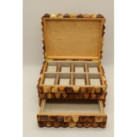 Cégünk által gyártott egyedi készítésű mintás fa karóratartó. Méret (szx mé xma): 29 cmx 23,5 cmx 17 cm, puha belső borítással. Hasznos információ: nem bírja a párát, a nedvességet és az erős hő behatását!