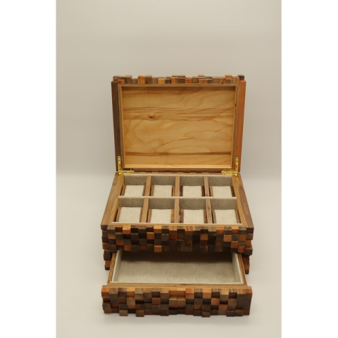 Cégünk által gyártott egyedi készítésű mintás fa karóratartó. Méret (szx mé xma): 30 cmx 23 cmx 17 cm, puha belső borítással. Hasznos információ: nem bírja a párát, a nedvességet és az erős hő behatását!