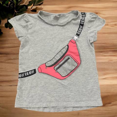Övtáskás felső Egyenes szabású, kerek nyakkivágású, elején csillámos mintával. Szép állapotú.