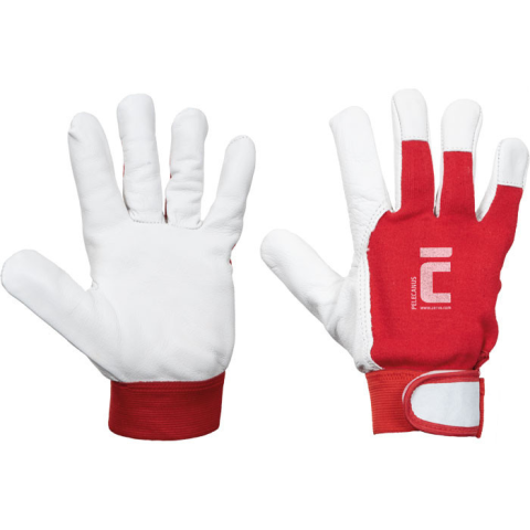 Varrott védőkesztyű finom kecskebőr tenyérrel, pamut szövet kézháttal. Köröm felett bőr takarás. Rugalmas, tépőzáras mandzsetta.