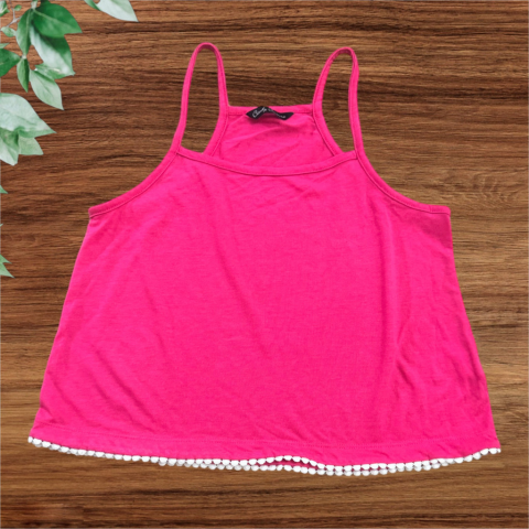 Pink sztreccses felső Bőszabású, alján fehér díszítéssel, spagetti pántos. Kellemes és kényelmes sztreccs anyag. Hibátlan állapotú.