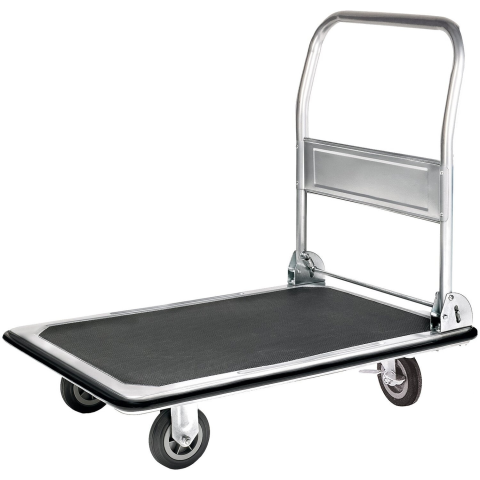 A platformkocsi 2 önbeálló görgővel és 2 bútorgörgővel rendelkezik. Az önbeálló görgők mindegyike biztonsági rögzítőfékkel rendelkezik. A rakodófelület stabil acéllemez-szerkezetből áll, és csúszásgátló gumibevonattal rendelkezik. Ezenkívül körben biztonsági ütközőszalaggal van ellátva. Mérete (Sz x Mé) 61 cm x 92 cm. A helytakarékos tárolás érdekében a tolószár behajtható. A kocsi maximális teherbírása 250 kg.