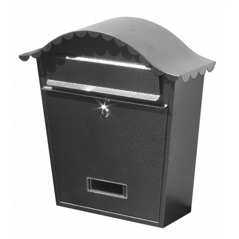 Vaslemezből készült, festett kivitelű postaláda, fekete és antracit színben. Elől bedobos és elől nyíló kivitelben. Levél csak szemből dobható bele, hátsó oldalán 4 db csavarral rögzíthető.