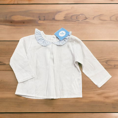 Galléros, háta gombos, csini apró pöttyös anyag. mell:2x25cm hossz:27cm Új, címkés termék.