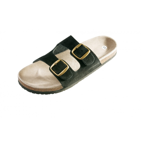 Habgumi talppal rendelkező, parafa papucs, dupla csatos bőr felsőrésszel Parafa papucs Felsőrésze bőrből készült Fém csatokkal rendelkezik Habgumi talppal Dupla csatos kivitel