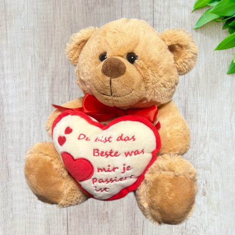 Puha mackó plüss, szívvel. Méret:23cm Hibátlan állapotú.
