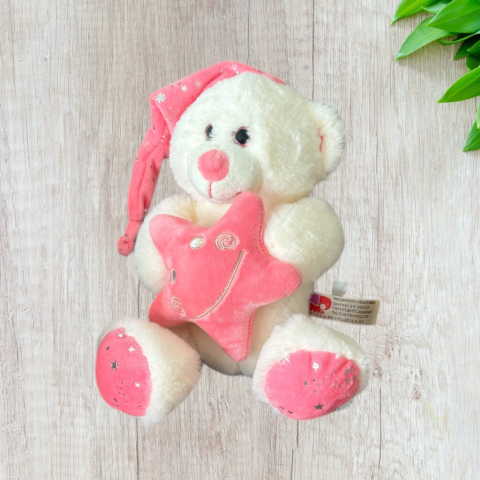 Puha mackó, rózsaszín sapkában Méret:31cm Hibátlan állapotú.