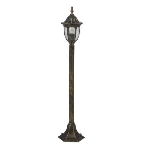 Klasszikus megjelenésű kültéri állólámpa, fröccsenő víz ellen minden irányból védett (IP43) kivitelben. Antik arany színű fém teste 1 db E27-es foglalattal, üvegburával és 102 cm-es magassággal rendelkezik. A lámpatest E27-es foglalatú, max. 60 W teljesítményű energiatakarékos fényforrásokkal is használható.