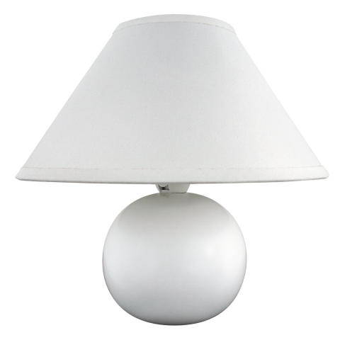 Hangulatvilágítást biztosító, időtlen stílusú asztali lámpa. Matt fehér színű, kerámiából készített lámpatesttel, textil lámpaburával, hálózati vezetékkel, kapcsolóval, 19 cm-es magassággal, és 20 cm-es átmérővel rendelkezik. Max. 40 W-os teljesítményű, E14-es foglalatú, hagyományos, halogén és energiatakarékos fényforrással használható.