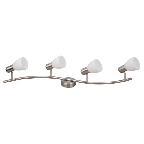 Időtlen megjelenésű mennyezeti lámpa, amely 4 db E14-es foglalattal, 70 cm széles, szatín króm színű, fém lámpatesttel, és fehér színű opálüveg burákkal rendelkezik. E14-es foglalatú, max. 40 W teljesítményű fényforrásokkal használható.
