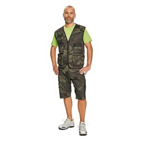 Könnyű férfi rövidnadrág, 190g/m? kevertszálas sávoly szövetből. Funkcionális zsebekkel: 2 oldalt, 2 cargo, 2 farzseb. Terepmintás anyagból.