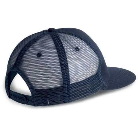 6 panel cotton cap with 100% polyester mesh and flat peakCotton-lined sweatbandAdjustable plastic tab closure90 gsm polyester mesh